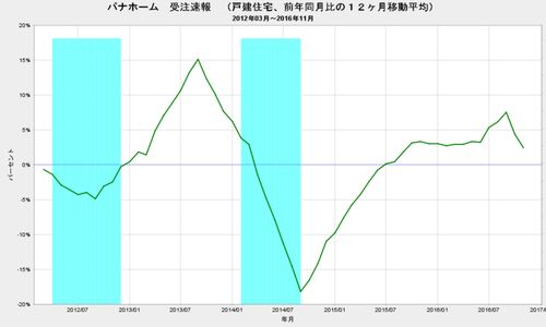 パナホームが発表した2016年11月の受注速報は、戸建住宅が金額ベースで前年同月比15%減でした。 前月比2ポイントの上昇でした。 前年同月比のトレンドを表す12ヶ月移動平均は、前月から2.0ポイント低下して、+2.4%となりました。 パナホ…
