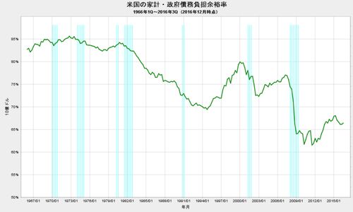 FRBが発表した資金循環表によると、2016年3Q末時点の米国の家計・連邦政府債務負担余裕率は、前期比0.3ポイント増の、66.4%となりました。 上のグラフは、1966年1Qからの米国の家計・政府債務負担余裕率の推移です。 見易さのために…
