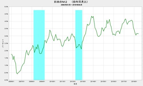 ・日本銀行 ・2018年6月 ・マネーストック統計 ・マネーストック(M2)の平均残高。1007兆1709億円 ・前月比、0.40%増 ・前年同月比、3.2%増 ・日本銀行時系列統計データ検索サイト