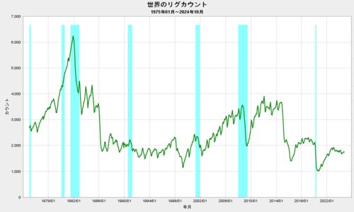 米・Baker Hughes社 2024年10月 世界のリグカウント 1754カウント 前月比、0.2%増 前年同月比、1.3%減 グラフの青色の部分は、米国の景気後退期間。 bakerhughesrigcount.gcs-web.com