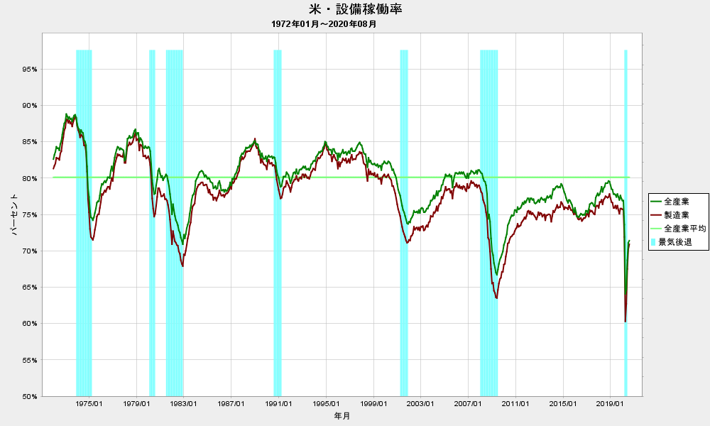 2020-09-19 2020/8 米・設備稼働率 71.4% △ 設備稼働率・鉱工業生産 ・FRB ・2020年8月・米・鉱工業生産統計・設備稼働率、71.4%・前月比、0.3ポイント増。・FRED TCU FRED MCUMFN