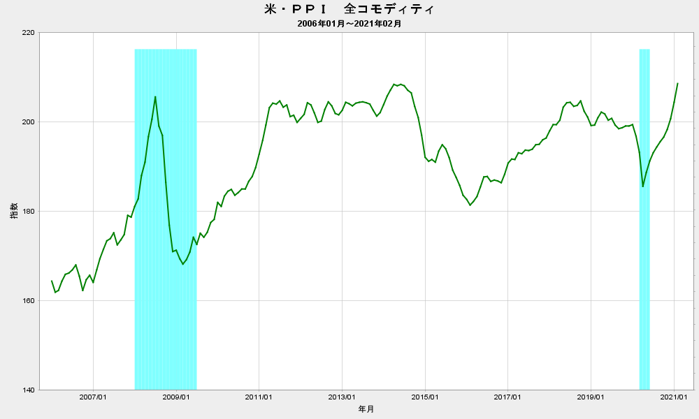 2021-03-14 2021/2 米PPI 前年同月比 +6.0% △ CPI/PPI 米・労働省 2021年2月 PPI統計 全コモディティ指数 208.5ポイント 前月比、2.1%増 前年同月比 6.0%増 fred.stlouisfed.org