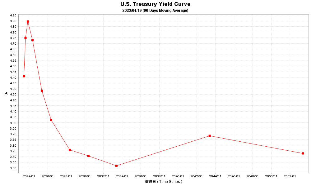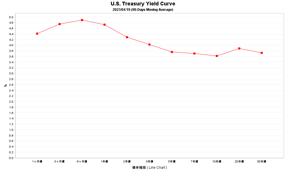 2023-04-21 2023/4/19 米国債イールドカーブ 全債券種類・全償還期間 イールドカーブ 米・財務省 2023年4月19日 米国債イールドカーブ・・・全債券種類と全償還期間 注) グラフの赤線は、3ヶ月債と10年債が逆イールドの関係になっていることを表しています。 www.federalreserve.gov www.nasdaq.com