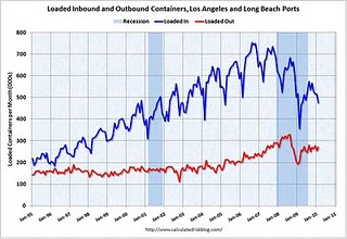 上のグラフは、ロサンジェルス地区(ロサンジェルス港とロングビーチ港)に入出庫するコンテナ数の1995年からの推移です。(注 このデータは季節調整されていません。)