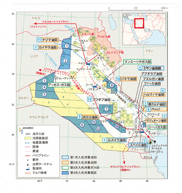 2012-08-22 JOGMEC イラクの原油生産に関する最新動向 石油・天然ガス #その他金融と投資 JOGMECが、イラクの原油生産に関する最新動向をレポートしています。 イラク最新動向:原油の大幅増産、第四次入札結果、ロシア企業参入等 上の地図は、イラクにおける第4次入札対象鉱区と開発中の主要油田を表しています。