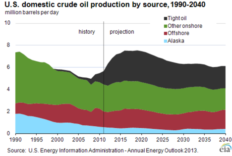 2012-12-19 EIA予測 2040年までの米国の原油生産量の推移(由来別) 石油・天然ガス #その他金融と投資 上のグラフは、EIAが、1990年から2040年までの、米国の原油生産量を由来別に集計ならびに予測した推移です。 Annual Energy Outlook 2013より このグラフのように、今後、2010年代後半から2020年にかけて、タイトオイル(シェール層由来の原油)の増産により、日量700万バレル台に達した後に、ピークアウトする予測になっています。