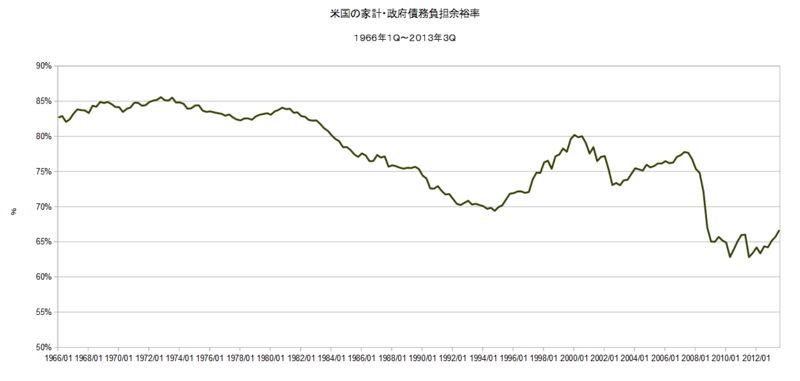 家計・政府債務負担余裕率とは、米国の家計及び非利益団体の正味金融資産が、その時点の全政府債務残高に対して、あと、どの程度をさらに負担が可能かを計算したものです。