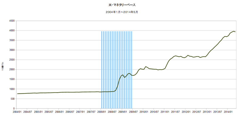 2014-06-28 2014/5 米・マネタリーベース 前月比 -0.8% ▼ FRB #FX、為替 FRBが発表した2014年5月の米国のマネタリーベースは、前月比0.8%の減少となりました。 5ヶ月ぶりの減少です。 また、前年同月比では、25.3%の増加となりました。 上の最初のグラフは、2014年1月からの米国のマネタリーベースの推移です。 二番目のグラフは、同じ期間でのマネタリーベースの前年同月比の推移です。 Monetary Base (AMBSL) 注)マネタリーベースとは、現金通貨と民間金融機関が保有する中央銀行預け金の合計のことです。 ◆◆◆ 二番目のグラフを見ると、QE、QE2、QE3の時間的推移と規模が良く分かります。