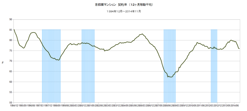 上の最初のグラフは、1994年12月からの首都圏マンション契約率(12ヶ月移動平均)の推移です。
