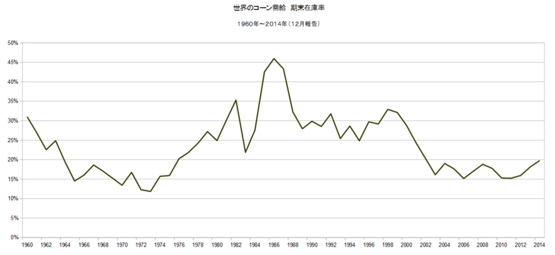 米・農務省が発表した世界のトウモロコシ需給報告(2014年12月報告)によると、2014/15年度の期末在庫率は、19.8%となりました。