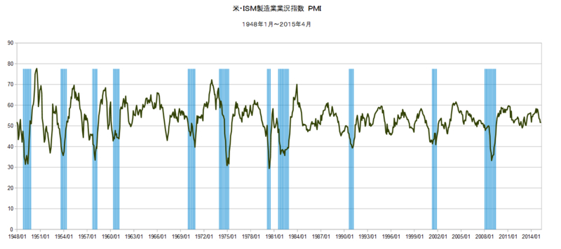 2015-05-02 2015/4 米・ISM製造業 PMI 51.5 => ISM指数 #その他金融と投資 米・供給管理協会(ISM)から、2015年4月の製造業景気指数が発表され、PMIは、前月と変わらず、51.5ポイントとなりました。 拡大と縮小の分かれ目となる50を、29ヶ月連続で上回りました。 ISM(米供給管理協会) 上のグラフは、1948年からのISM製造業景気指数(PMI)の推移です。 NAPM