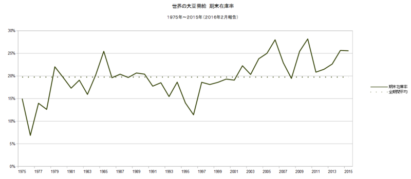 上のグラフは、1975年からの世界の大豆需給における期末在庫率の推移です。