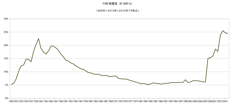 上の最初のグラフは、1929年からの、米国のGNPに対するFRB総資産の比率の推移です。