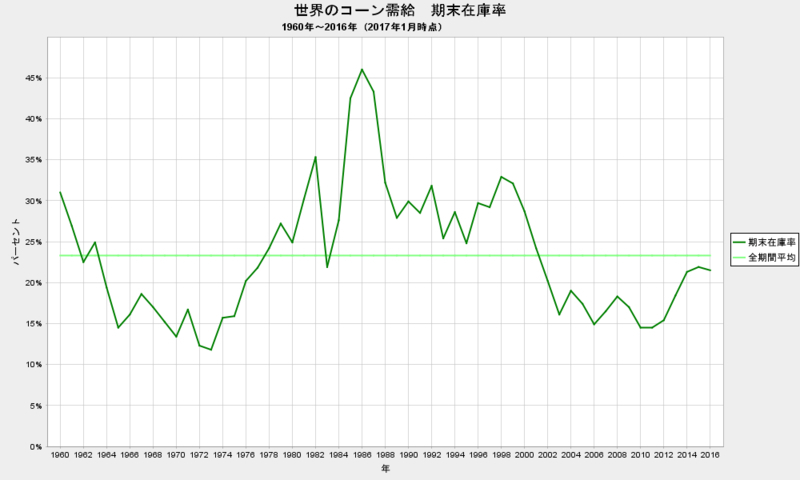 2017-01-16 2017/1 世界のコーン需給 在庫率 21.5% ▼ とうもろこし #その他金融と投資 米・農務省が発表した世界のトウモロコシ需給報告(2017年1月報告)によると、2016/17年度の期末在庫率は、前月から0.2ポイント低下して、21.5%となりました。 米国農務省穀物等需給報告 USDA Grain: World Markets and Trade 上のグラフは、1960年からの世界のトウモロコシの期末在庫率の推移です。 注) 点線は、全期間の期末在庫率の平均値です。