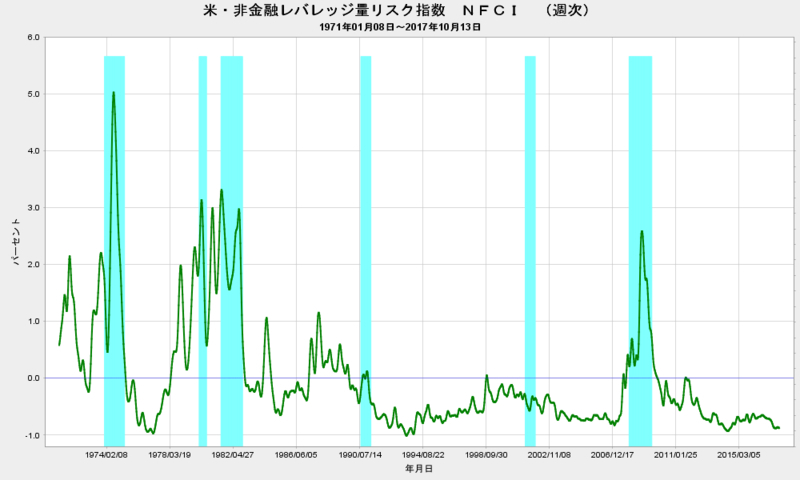 2017-10-25 2017/10/13 米・非金融レバレッジ量リスク指数 -0.88 ▼ 金融市場 #株式 ・米シカゴ連銀 ・2017年10月13日 ・非金融レバレッジ量指数(NFCI) ・NFCIリスク指数、マイナス0.88ポイント。4週前から0.01ポイント低下。 ・FRED NFCIRISK