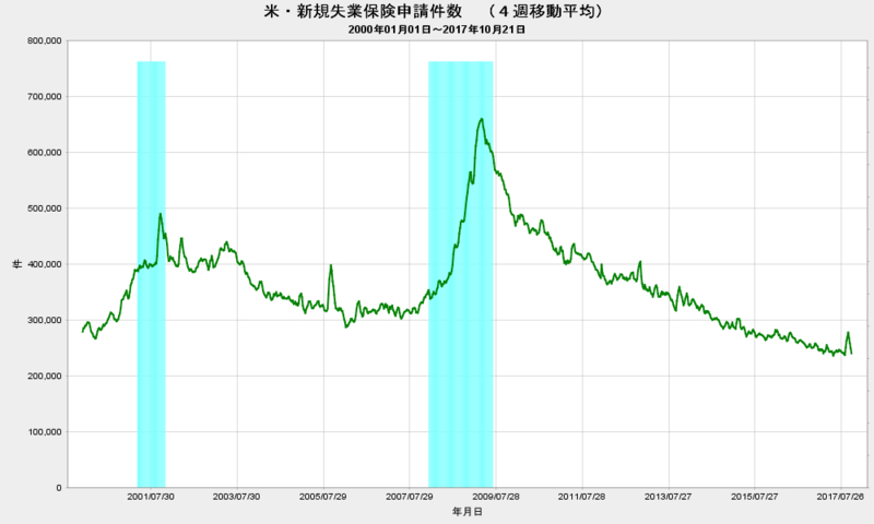 2017-10-27 2017/10/3週 米・失業保険申請 23.3万件 △ 雇用 #その他金融と投資 ・米・労働省 ・2017年10月21日 ・米・新規失業保険申請件数 ・23.3万件。前週比、1.0万件増 ・FRED IC4WSA