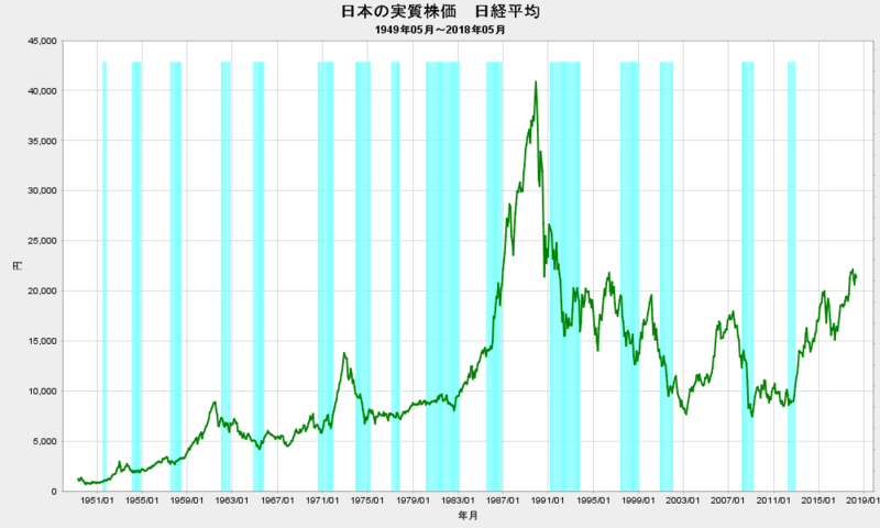 2018-06-06 2018/5 日本の実質株価 前月比 -1.3% ▼ 日本株 #株式 2018年5月の日経平均株価の月次終値は、物価変動を考慮した実質値で、前月比1.3%低下しました。 前年同月比では、12.4%の上昇でした。 日経平均プロファイル => ダウンロードセンター 上の最初のグラフは、1949年5月からの日経平均株価の月次終値の推移です。 物価変動の影響を除去するために、実質値をプロットしています。 インフレ率:消費者物価指数(東京都区部持家の帰属家賃を除く総合)の前年同月比 政府統計 消費者物価指数 長期時系列データ 上の二番目のグラフは、2006年1月からの日経平均株価の月次終値の推移です。 やはり、物価変動の影響を除去するために、実質値をプロットしています。