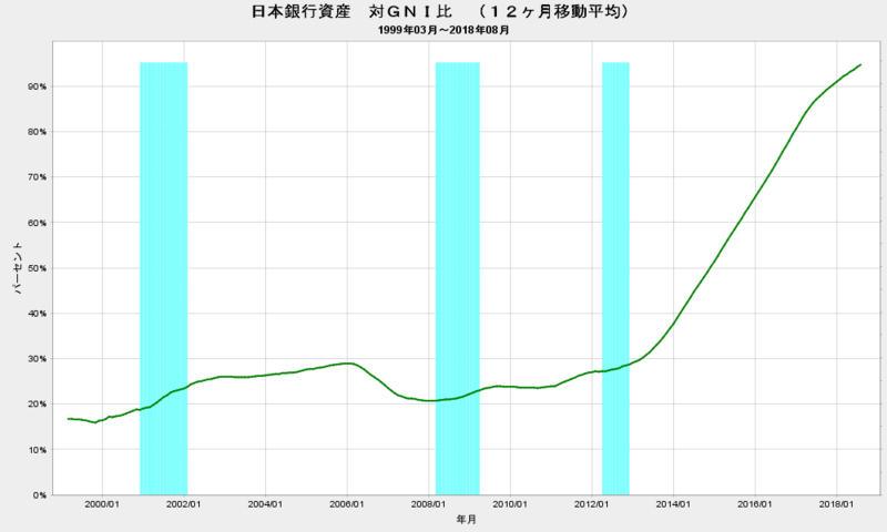 2018-09-13 2018/8 日本銀行資産 対GNI比 97.9% △ 日本銀行 #その他金融と投資 2018年8月末時点の日本銀行のバランスシート(総資産)は、前月比0.8%増の、550.9兆円となりました。 前年同月比では、7.7%の増加となりました。 日本銀行の総資産の対GNI比は、前月比0.8ポイント増の97.9%となりました。 ※GNI・・・国民総所得。GNPに相当。 日本銀行時系列統計データ検索サイト 内閣府GDP統計 上のグラフは、1999年3月からの日本銀行総資産の対GNI比の推移です。 トレンドを見易くするために、12ヶ月移動平均をプロットしています。
