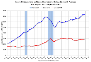 2018-11-15 2018/10 LA港・取扱量 +27.22% 前年同月比 貿易 #その他金融と投資 2018年10月の米・ロスアンゼルス港のコンテナ取扱量(季節調整前)は、95.2万TEUsとなり、前年同月比で、27.22%の増加となりました。 PORT OF LA また、同月の米・ロングビーチ港のコンテナ取扱量(季節調整前)は、70.5万TEUsとなり、こちらは、前年同月比で、5.4%の増加になりました。 PORT OF LONG BEACH 上のグラフは、ロスアンゼルス地区(ロスアンゼルス港とロングビーチ港)に入出庫するコンテナ数の12ヶ月移動平均の1996年からの推移です。 青い線が入庫数、赤い線が出庫数です。 拡大図は、以下のリンクを開いて、該当するグラフをクリックしてください。 LA area Port Traffic in October; Record Imports